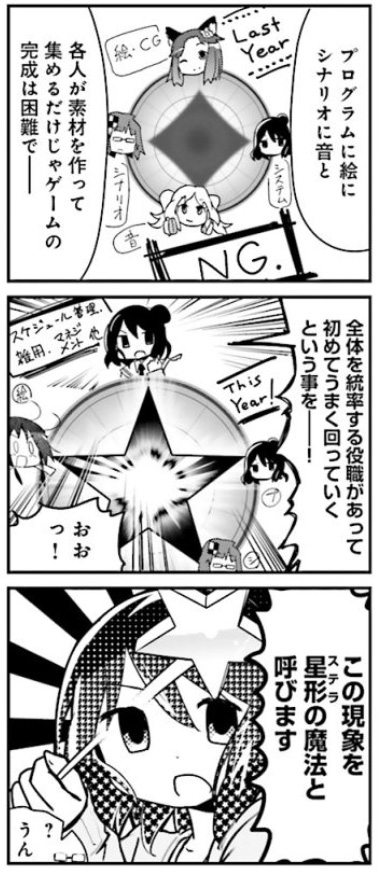 くろば:最初の案はラノベのタイトルっぽく、「締め切りいつだと思ってる?」みたいなものだった気がします。同人ゲームを作る作品だから「ツクール」って名前を入れる案もあったんですけど、人様のツールに乗っかるのはどうなんだろうと思いボツにしました。最終的に、担当さんといくつか案を出し合った中から、部員それぞれがバランスを取り合ってという1巻のオチも意識して『ステラのまほう』というタイトルになりました。