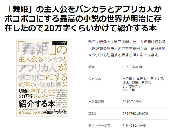 4月24日、柏書房から『「舞姫」の主人公をバンカラとアフリカ人がボコボコにする最高の小説の世界が明治に存在したので20万字くらいかけて紹介する本』という無茶なタイトルの書籍が発売されました。