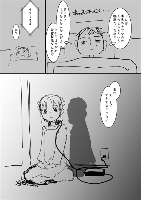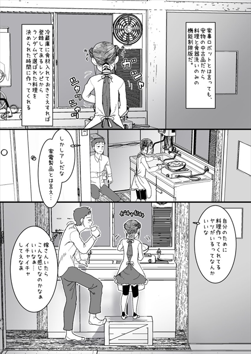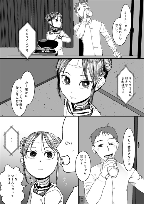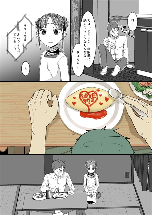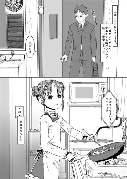 主人公のタクマは一人暮らしのサラリーマン。家事をする時間がなく、女の子の姿をした中古の家事ロボットを購入しました。家事ロボット「ミーナ」が食事を作るのを見ながら、家電製品とは言え自分のために料理を作ってくれる存在があるのは「なんかいいな」と感心するタクマ。自分の好物のオムライスを覚えて作ってくれた彼女に「一番好きなのはミーナちゃんだな〜」と告白します。「なーんちゃって」と照れ隠しにごまかしたタクマですが、彼の前に出されたオムライスには「LOVEタクマ」とケチャップで書かれていたのでした。