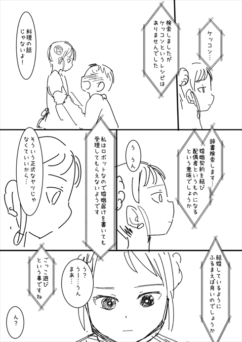 オムライスのメッセージが、本当のラブなのかただの機能なのかと気になってそわそわしてしまうタクマ。ミーナに直接聞くこともできず酒に逃げ、酔った勢いで「結婚して」とプロポーズしてしまいます。ミーナは法的には結婚できないけれど、夫婦らしく振る舞うことはできると、まさかの結婚承諾。
