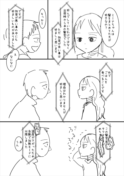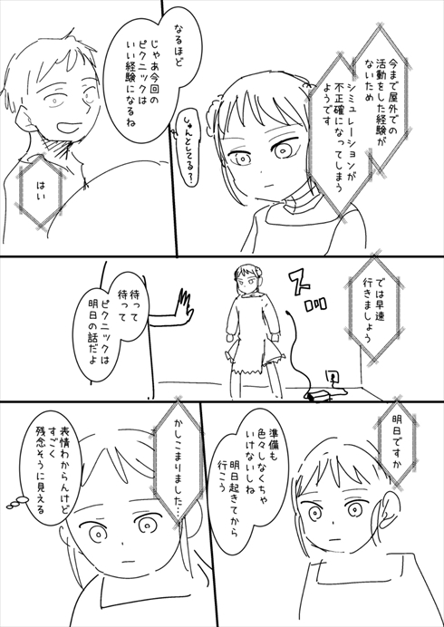 そこから2人の結婚生活が描かれていくのですが、読み進むにつれて気になっていくのが「ミーナには感情が芽生えているのでは?」というところ。例えばタクマとピクニックに出かけるエピソードでは、天気が悪くなって太陽発電の効率が落ちたことに気づいていながら、ミーナは調理機能にエネルギーを使うことを選択。非合理な選択の結果、電池切れになってしまいます。「プログラムにエラーがあるのかも」と言うミーナですが、それはエラーなのかそれとも……?