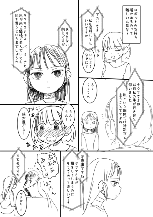 他にも、タクマからもらった指輪を「なぜか」ずっと見つめてしまったり、自分が廉価版だったために前の持ち主に売られたことを「タクマさまと出会えたので廉価版でよかった」と話したり……どうにもミーナに感情が生まれているように見えてしまいます。「そうあってほしい」と思う気持ちがそう見せているのか、本当にミーナが心を持ち始めているのか……。なんとももどかしい気持ちになります。