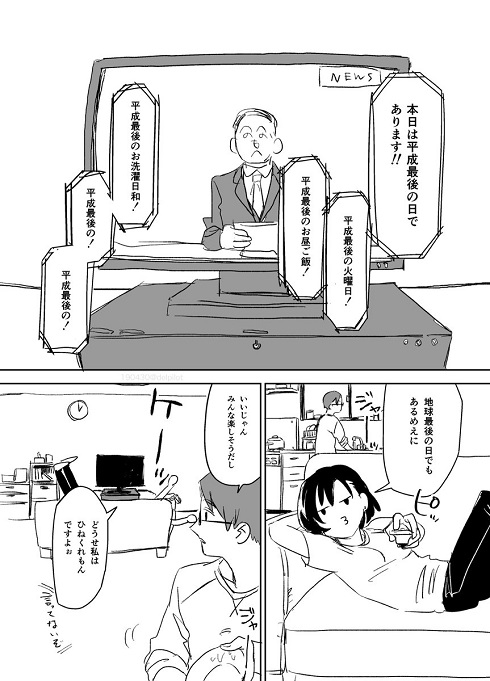 「平成最後の火曜日!」「平成最後のお洗濯日和!」としつこく“平成最後”を繰り返すテレビに「地球最後の日でもあるめえに」と白ける妻。世間の熱気に対し、どこにも出かけず自宅で暇な休日を過ごしているためすっかりひねくれているようです。