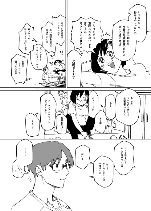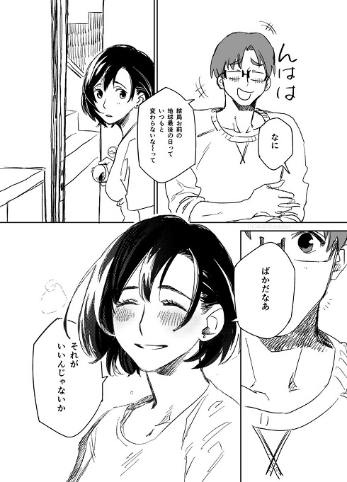 “平成最後”のように人生で二度と来ない日とわかっていると特別な意味を持たせたくなってしまうもの。それに動じずいつもの調子で2人の時間を満喫しようとする姿に、強い愛を感じる作品です。面と向かって自分の言葉で、どんな日でもあなたと笑っていたい、と言えてしまう仲とかロマンスすぎる……地球最後の日に家で「ホーム・アローン」とか優勝でしょ……。