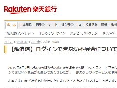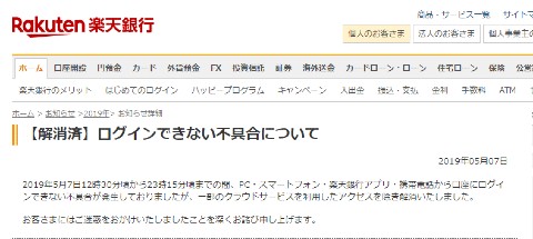 障害発生は5月7日12時30分ごろから23時15分ごろまで10時間以上。PC、スマートフォン、楽天銀行アプリ、携帯電話から口座にログインできない状態でした。一部のクラウドサービスを利用したアクセスを除いて解消したとしています。