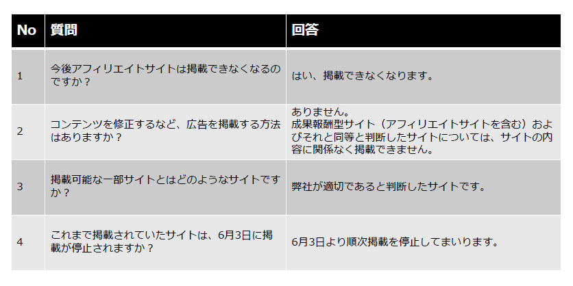 発表資料内「よくある質問」でも、アフィリエイトサイトの広告掲載について「はい、掲載できなくなります」ときっぱり回答