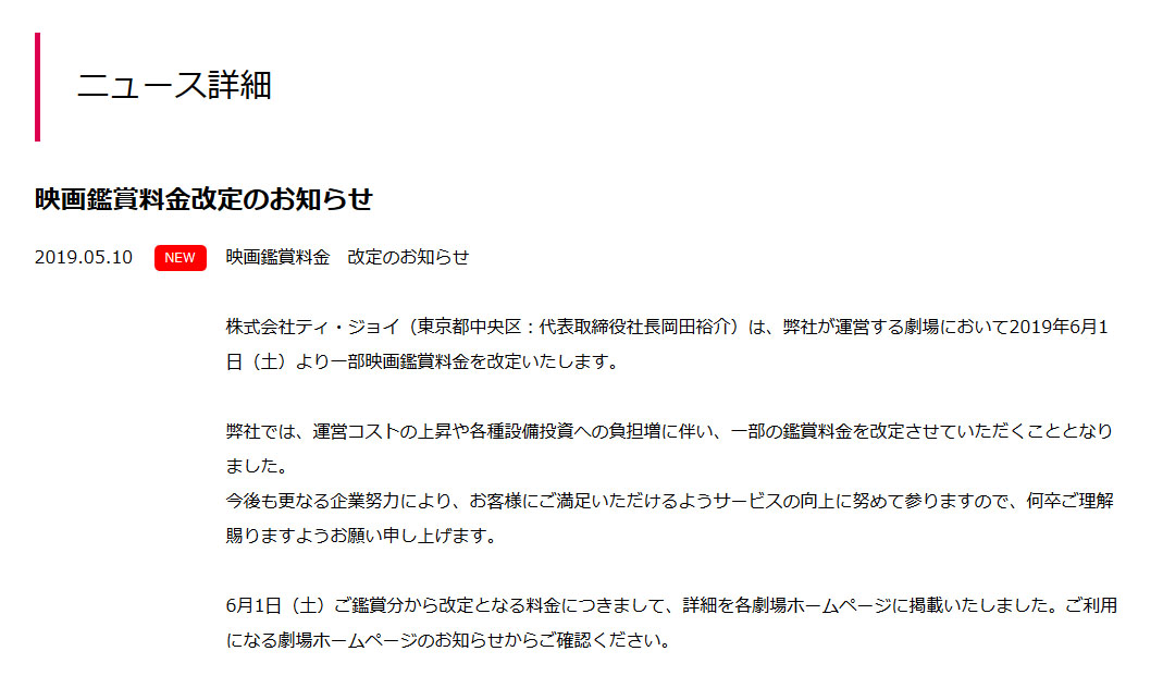 映画鑑賞料金改定のお知らせ