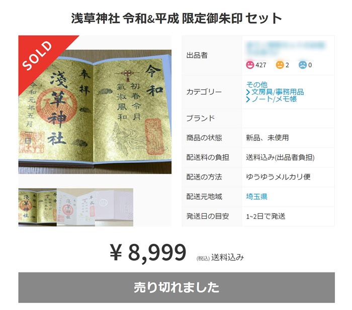 また特別御朱印や参拝証明書がネットオークションやフリマアプリで転売されている状況についても「断じて看過することはできません」「この行為により、当日御朱印を受けられなかった方がいると思うと悲しくて仕方ありません」として、御朱印の本来の意義をあらためて理解してほしいと呼びかけています。編集部で調べたところ、確かに浅草神社で頒布された平成令和の特別御朱印が9000円近い金額で販売されているケースがあり、この御朱印は売り切れていました。