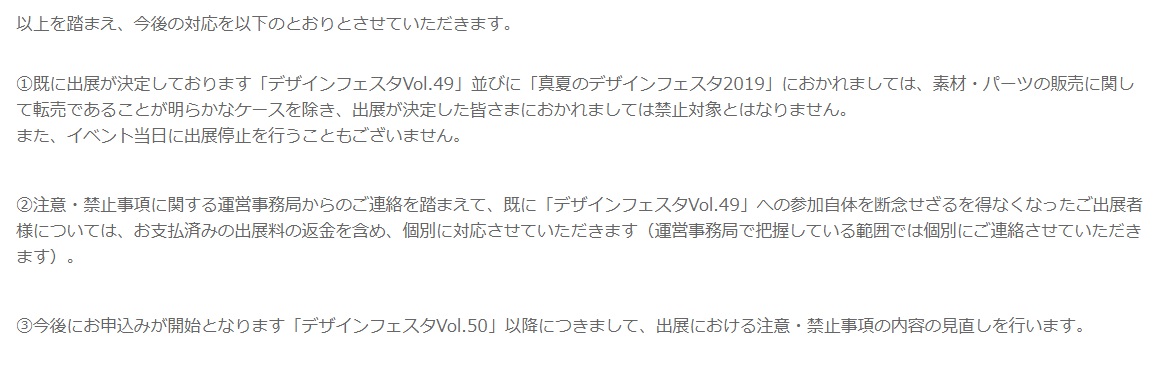 (1)既に出展が決定している「デザインフェスタvol.49」と「真夏のデザインフェスタ2019」については、素材・パーツの販売に関して転売であることが明らかなケースを除き、出展が決定したクリエイターについては禁止対象にならない。イベント当日に出展停止を行うこともない。