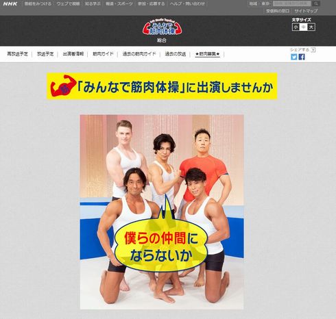 NHK「みんなで筋肉体操」が出演者を募集中 「★筋肉募集★」というマッチョな求人文言も