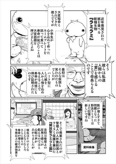 近年発見された新種の生物「ラミラミ」。紙を食べるのですが、愛情が込められたハート型の紙を食べると寿命が伸びることが発見されました。数が増えすぎた問題を解決するため、ラミラミはパークに集められ、そこで人間に芸を見せたり、個性をアピールしたりしてハートの紙をもらって食べることで生きています。