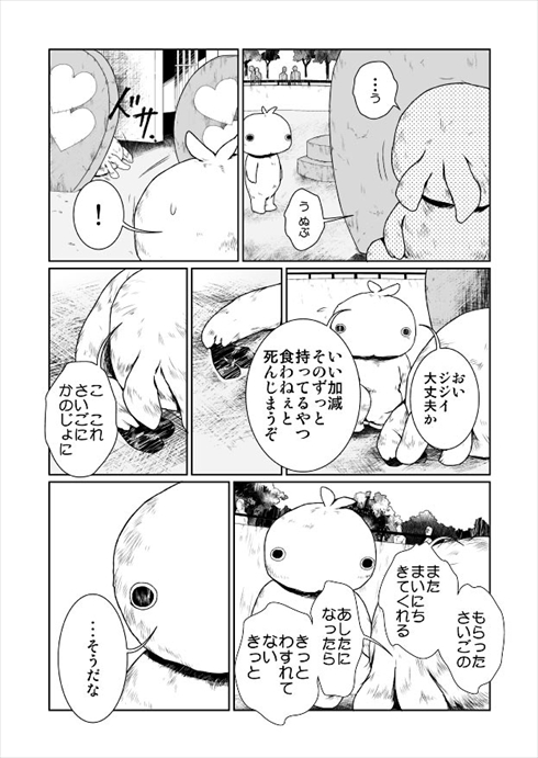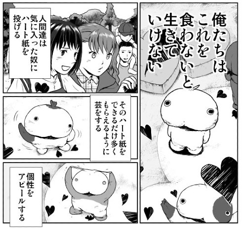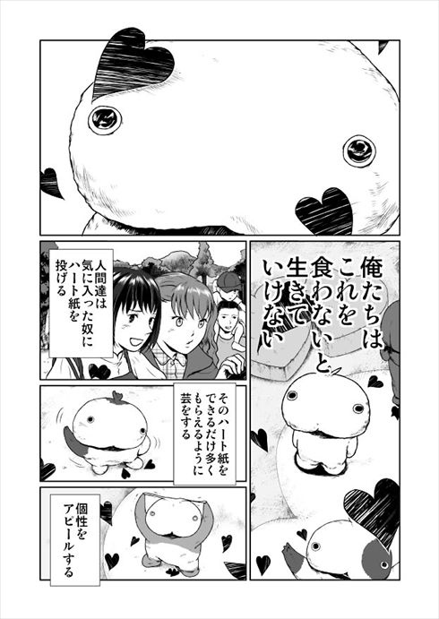 その後主人公のもとに、飼育員が結婚して仕事を辞めることを伝えに来ます。笑顔で「この仕事が好き」だと話していたのに……楽しそうに仕事をしていたのは嘘だったのかと詰め寄る主人公。悲しそうな彼女を見送ったあと、人間の前へ出ます。一番人気の子のまねをして失敗し、それでもいつもより多くのハートをもらった主人公。もらったハートをむさぼりながら、その中に彼女の愛があったことに気づいて涙を流すのでした。