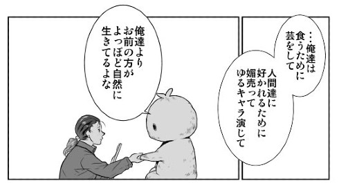 主人公のラミラミは、人間に媚を売る自分たちを不自然と感じ、懸命に芸の練習をする一番人気のラミラミになぜそこまでするのかと疑問を投げかけます。初めての人間への顔見せで、その子が人間の愛を「嘘」だと言うのを見ていたからです。自分たちの食べている「愛」は薄っぺらなもの――しかし一番人気の子はそれを知りながらも「食べなければ死んでしまう」「それが現実」「もうこれしかない」と悲壮な様子で語ります。