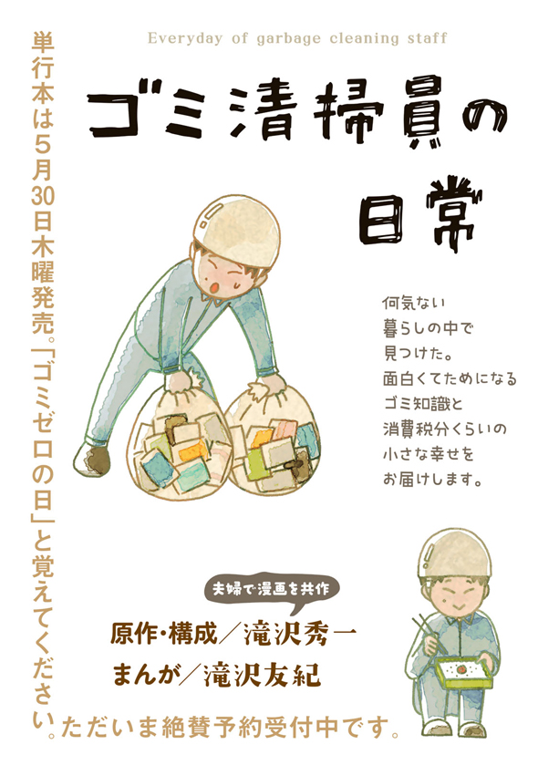 Twitterで閲覧数驚異の3200万超え。読むと分別したくなるエッセイ漫画。売れない芸人・マシンガンズの滝沢秀一は家族を養うためにゴミ清掃員に。何気ないゴミ清掃員の日常。その生活で見つけたゴミの知識やちょっとばっかりの幸せを届けます。滝沢秀一がネーム原作を、それを妻である滝沢友紀がタブレットひとつで作画。夫婦共作(どっちも漫画描いたことない)でお送りします。