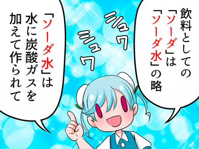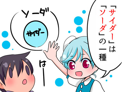 まずは「サイダー」「ソーダ」の違いについて。「サイダー」は「ソーダ」の一種で、そもそも飲料としての「ソーダ」は「ソーダ水」を略したものです。