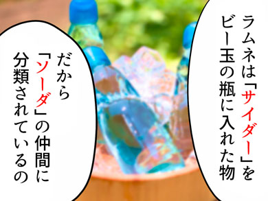 このソーダ水に甘味や香りをつけたものが「サイダー」で、これはもともとリンゴ酒を意味する「cider」に由来します。ラムネはサイダーをビー玉の瓶に入れたもの。よってソーダの仲間といえます。