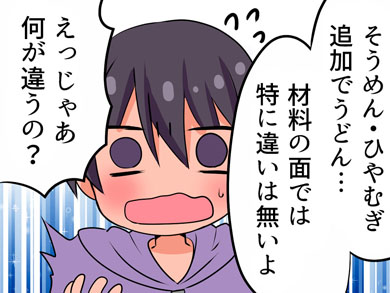 お次は「そうめん」と「ひやむぎ」の違いについて。違いは「麺の太さ」で決まります。うどんも含め、材料は同じなのです(小麦粉・水・塩、場合によっては油)。