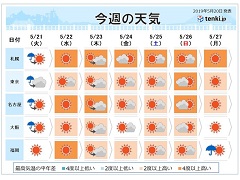 21日(火)は東海から北海道は荒天に。関東と東海では大雨の恐れ。22日(水)以降は、季節先取りの暑さ。特に25日(土)と26日(日)の最高気温は、多くの所で7月並み。熱中症に注意