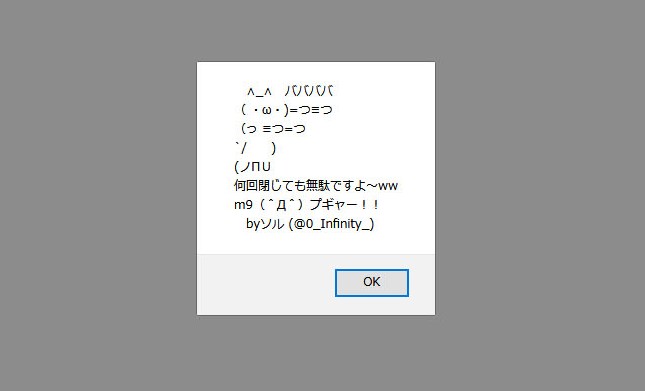 猫のアスキーアート(AA)とともに、「何回閉じても無駄ですよ〜ww」と書かれたポップアップが繰り返し表示されるサイトのURLをインターネット上の掲示板に書き込んだとして、13歳の女子中学生が補導、39歳と47歳の男性が家宅捜索を受けたとの報道がなされたのは3月初旬のこと。一部では掲示板に貼られたURLが「ブラウザクラッシャー」(通称:ブラクラ)にあたるとの報道もありましたが、問題視されたURLを確認してみると当該プログラムにブラウザをクラッシュさせる機能はなく、厳密には「無限アラート」へのリンクであり「ブラクラではない」という意見の人が多くみられます。