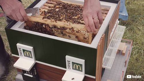 この新店舗は「McHive(マックハイブ)と呼ばれ、ハイブとは“蜂の巣”を意味します。もうお気付きだと思いますが、これはマクドナルド・スウェーデンがミツバチのためにオープンしたものなのです。店内は養蜂箱になっており、ミツバチのお客さんで賑わっています。