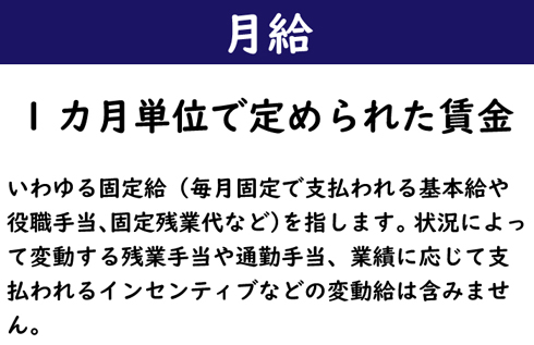 • いわゆる固定給(毎月固定で支払われる基本給や役職手当、固定残業代など)を指します。状況によって変動する残業手当や通勤手当、業績に応じて支払われるインセンティブなどの変動給は含みません