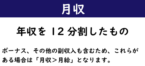 • ボーナス、その他の副収入も含むため、これらがある場合は「月収>月給」となります。