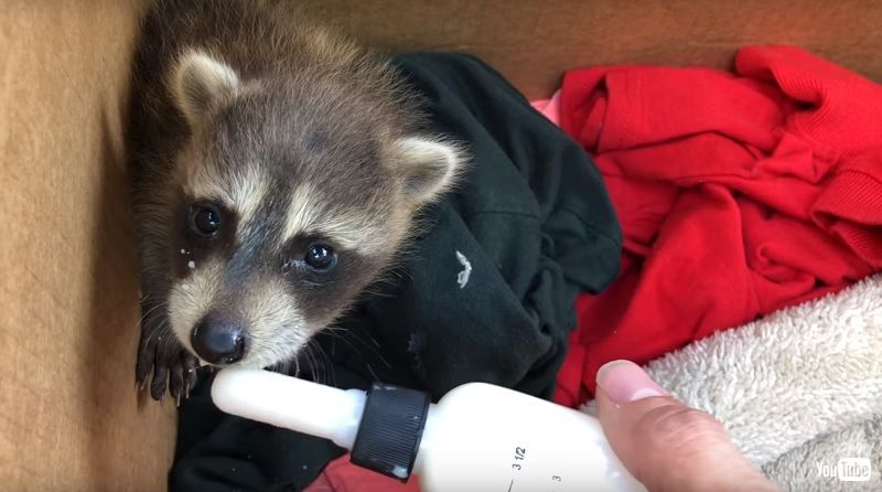 運よく助けられた赤ちゃんアライグマは生後5〜6週間ほどでとても小さく、まだヨチヨチ歩き。1匹で生きていくには幼すぎます。男性はペット用品店でミルク、ベッド、トイレ用シートなどを購入。アライグマのぬいぐるみを一緒に購入したところに、赤ちゃんアライグマへの愛情が垣間見えます。