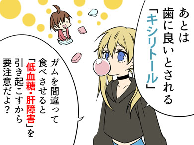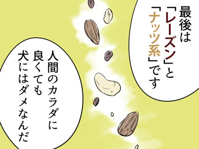歯にいいイメージがある【キシリトール】もNG。これを犬に与えると低血糖や肝障害を引き起こします。ガムなどを誤って食べないように注意が必要ですね。さらに、【レーズン(ぶどう)】は腎障害を、【ナッツ系】は嘔吐などを引き起こします。