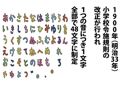 そんな和気あいあいとしたひらがなの世界に、突如として激震が走ります。1900年(明治33年)、小学校令施行規則の改正が行われ、「学校教育で用いるひらがなは1つの音につき1文字、全部で48文字に限る」という内容のお触れが全国に出されたのです。