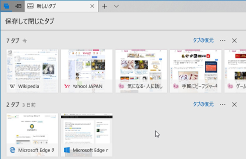 また、「開き過ぎちゃったからページをいったん閉じるけど、またあとで見直したい」というときには、Edgeの画面上部のバーに「表示中のタブを保存して閉じる」「保存して閉じたタブ」というボタン。