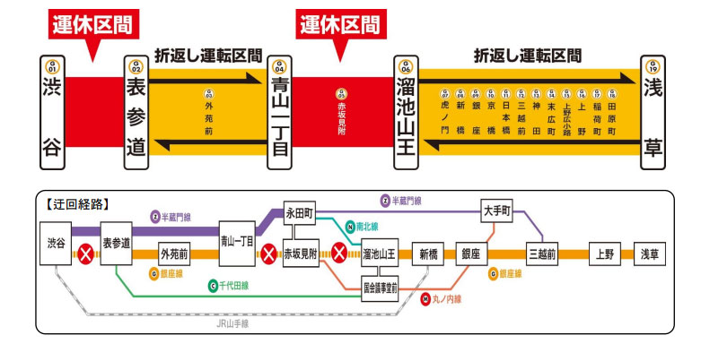 東京地下鉄(東京メトロ)は、銀座線の渋谷〜表参道間、青山一丁目〜溜池山王間を2019年12月28日〜20年1月2日の6日間、終日運休します。