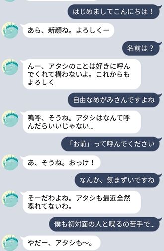 お互いに初対面なのでまずはフワフワとした会話を重ねながら、徐々に意気投合していきます。意外と人見知りだったのか、自由なめがみ。