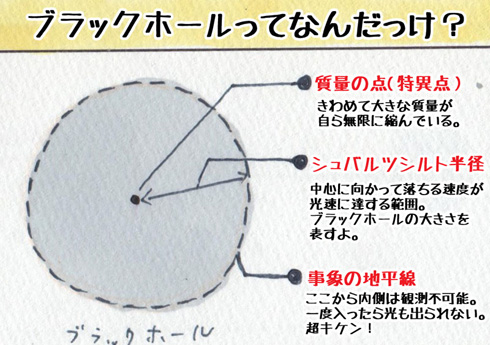 ブラックホールは「巨大な質量が無限に小さく縮んだ点」「事象の地平線」がセットになった概念です。