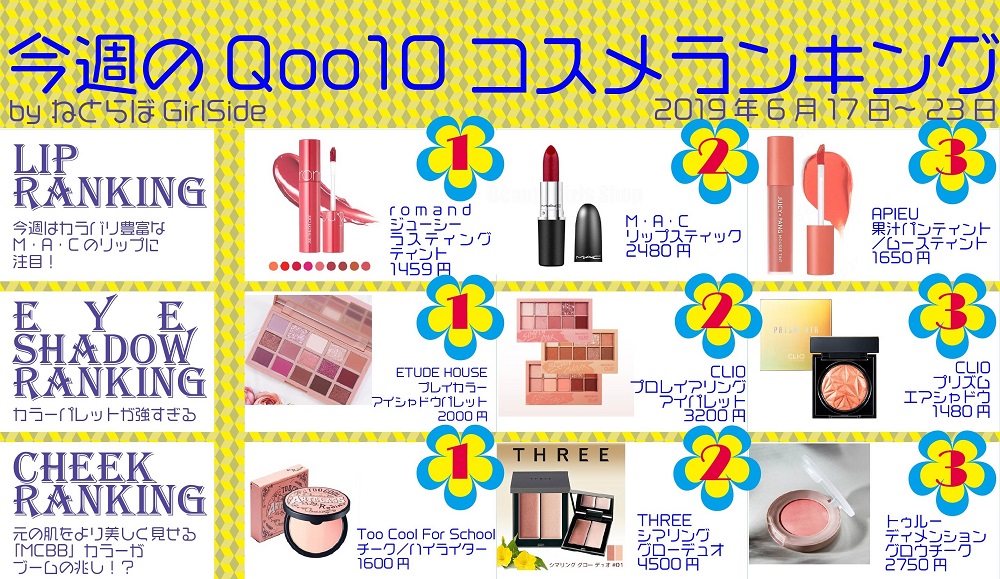 インターネット総合ショッピングモール「Qoo10」のランキング(6月17日〜23日)から、リップ・アイシャドウ・チークの3部門の人気コスメを紹介します。今週はチークの新潮流、「MCBB」カラーに注目です!