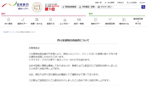 日本旅行、誤って内定メールを一斉送信 原因は「担当者の不手際」
