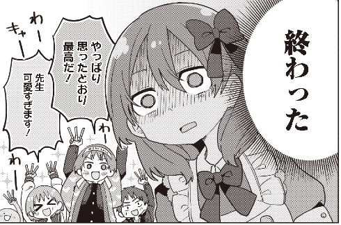 生徒にフリフリ衣装を着てほしいとせがまれたり、授業がうるさいという苦情を受けて乗り込んできた教頭先生が実は「元アイドルのおっかけ」でノリノリになってしまったり、学級委員長が押しかけマネジャーになったり……生徒たちの勢いに振り回される押谷先生。でもなんだかんだでつきあってくれるのがかわいくて、推したくなってしまいます。