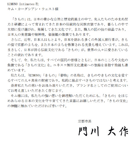 また京都市は28日、カーダシアンさんと商標登録を申請している会社KIMONO Intimatesに、「KIMONO」のブランド名を使用することについて再考を求める文面を送ると発表。門川大作市長の署名入りで「私たちは,『KIMONO』『きもの』『着物』の名称は,きものやきもの文化を愛するすべての人々共有の財産であり,私的に独占すべきものではないと考えます。是非私たちの思いをお汲み取りいただき,ブランド名としてのご使用についてお考え直しいただきたく存じます。キム様には,私たちの強い思いを御理解いただくためにも,『きもの』をはじめあらゆる日本の文化を守り育ててきた京都にお越しいただき,『きもの文化』の神髄に触れていただければ幸いです」と記しています。