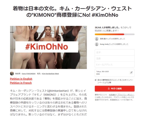 署名サイトChange.orgでは26日にカーダシアンさんにあてた署名「着物は日本の文化。キム・カーダシアン・ウェストの"KIMONO"商標登録にNo!」が立ち上げられました。ブランド名が日本の伝統衣装である「着物」を想起させること、商標登録の申請を行っていることに「我々の誇る文化である着物へのリスペクトに欠けるネーミングと言わざるを得ません」と抗議し、海外からの支持者も含め3万5000人の賛同を集めています。