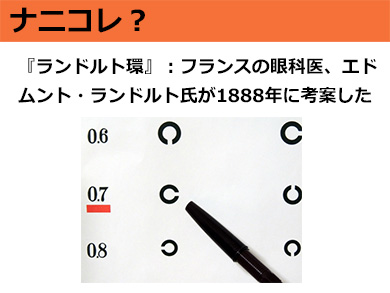 『ランドルト環』:フランスの眼科医、エドムント・ランドルト氏が1888年に考案。「円環の直径:円弧の幅:開いている部分の幅=5:1:1」になっている。