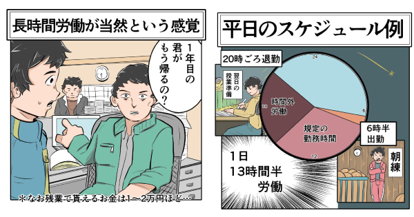 服務規程の勤務時間は8時15分〜16時45分なんだけど、若手で独身の先生って、朝6時半くらいには学校に来てたりする。7時半に部活の朝練が始まるんだけど、教員がいないときにケガとかのトラブルがあると問題になる。見てないといけない。だから、朝のうちに自分の仕事を片付けるためには、もっと早く学校に来る必要があるわけ。