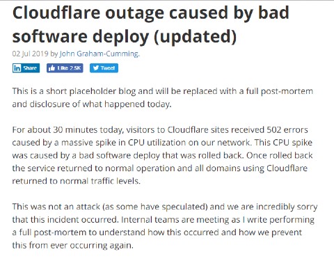 CDN(コンテンツデリバリーネットワーク)サービスのCloudflareは、日本時間7月2日夜に起きたサービス障害について、原因はソフトウェアの配備ミスと説明しました。