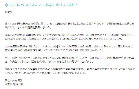 『花とゆめ』(白泉社)編集部は7月5日、6月20日発売の同誌14号に掲載されていた読み切り作品について、主人公のキャラクターが他の作家の絵柄に酷似しているとの指摘があったとして謝罪しました。