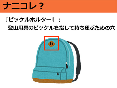 『ピッケルホルダー』:もともとは、登山用具のピッケル(雪山を登るためのつるはしのような道具)をさして持ち運ぶための穴。現在はカジュアルなデイパックなどにも取り入れられる定番デザインとなった。