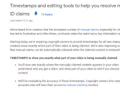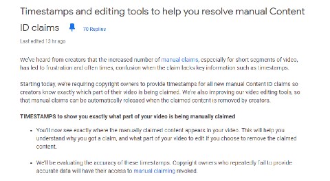 この変更により、手動で著作権侵害を申し立てる際は、具体的に動画のどの部分が侵害に当たるのかをタイムスタンプで示す必要があります。タイムスタンプは動画の投稿者にも伝えられるため、投稿者はどの部分を編集すればいいのか分かりやすくなるとしています。またYouTubeはタイムスタンプの正確さをチェックし、申立人が正確なデータの提出に何度も失敗した場合は申し立てが取り消されます。