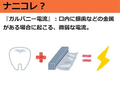 『ガルバニー電流』:口内に銀歯などの金属がある場合に起こる、微弱な電流。異なる金属同士が唾液を介して接触すると流れるもので、スプーンなどを噛んだときや、上下の歯で異なる金属の詰め物をしている場合にも起こる。