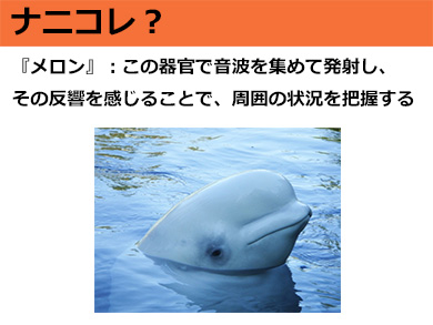 『メロン』:このメロン器官に音を集中させて前方へ発射し、はねかえってきた音波によって周囲の状況を把握する。ちなみに触るとぷるぷると柔らかい。
