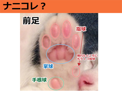 『掌球(しょうきゅう)』『指球(しきゅう)』『手根球(しゅこんきゅう)』:猫は前足の方が指が1本多く、それに対応して肉球も1つ多い。5つ目の指球は、他の4つとは離れた場所についている。