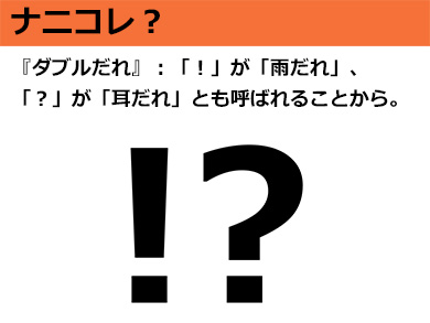 『ダブルだれ』:「!」が「雨だれ」、「?」が「耳だれ」とも呼ばれることから。「感嘆符疑問符」というそのままの呼び方もある。