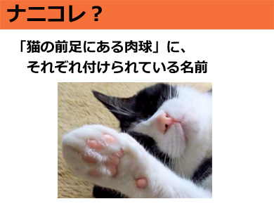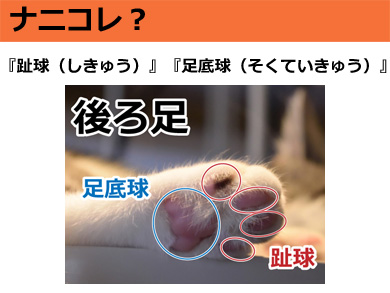 『趾球(しきゅう)』『足底球(そくていきゅう)』:肉球がプニプニしているのは内側に脂肪、弾性繊維が詰まっているからで、高いところから着地した際の衝撃吸収の役割などがある。