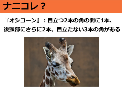 『オシコーン』:キリンには実は5本の角がある。目立つ2本の角に加え、その間に1本、後頭部に2本。皮膚に覆われたこれら3本の角は「オシコーン」と呼ばれる。